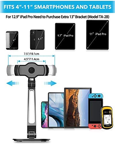 Universal Apple iPad holder with clamps on both sides fits any 4″-11″ display tablet PCs (iPad Air/Mini/10.5-inch iPad Pro/Galaxy Tab) or Smartphones (iPhone 13, 13Pro, 13Pro Max, 12, 12Pro, 12 Pro Max 11, X 8 & 8 Plus 4/5/6/7/Plus/Samsung Galaxy) with width or length measurement in the range of 4.5-7.5″, an ideal ipad desk mount great for home office and business occasion