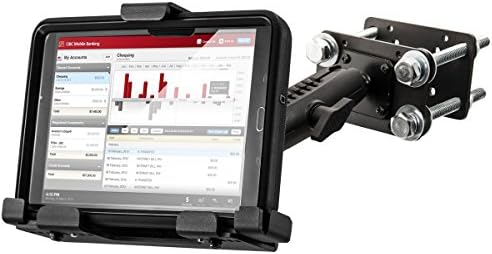 FLBKTAB04 is a locking tablet mount specifically designed for use on a forklift, pallet jack, or other warehouse vehicle. Consisting of two steel plates with black powdercoat finish and accompanying mounting hardware, FLBKTAB04 is made with heavy gauge steel construction to last in tough environments, such as construction sites, factories, and warehouses. This 5” forklift mount is composed of a 3.75” Robust Mount Shaft with double ball adjustment points and a Metal Universal Locking Tablet Holder, which features a key lock (keys included) that keeps the tablet securely in place. The tablet holder is made of aluminum and includes multiple horizontal and vertical adjustment points along both sides, making it compatible with tablets as small as the G Pad 7.0, or as large as the Nexus 10. Use a 7mm and 10mm socket wrench to adjust the tablet holder to your tablet’s size specifications. Security hardware is also included. Each of the mount’s steel plates weighs just under half a pound and measures 4” x 2.75” x 1/8”. Holes are pre-drilled into the plate so installation is quick and easy.