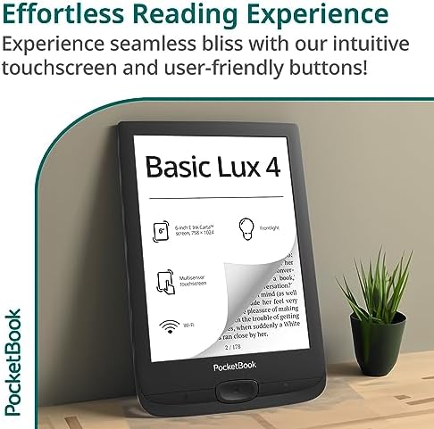 Basic Lux 4: Step into a World of Endless Stories Dive into a world of eye-friendly and comfortable reading with our 6-inch touch screen, powered by E-Ink Carta technology. Say goodbye to glare and eye strain as the screen mimics the soothing feel of ordinary paper, making reading a delight wherever you go. Supporting an impressive 25 formats, from ACSM to PNG, it offers unparalleled freedom in reading choice. Elevate your learning journey with 11 preloaded dictionaries and 42 additional language combinations, making your reading experience more enriching and productive. Embrace the joy of e-books without limitations! Our Basic Lux 4 lets you immerse yourself in captivating stories anytime, anywhere, regardless of the lighting conditions. With the simple flick of the frontlight switch, you can delve into your favorite reads even in the darkest corners.