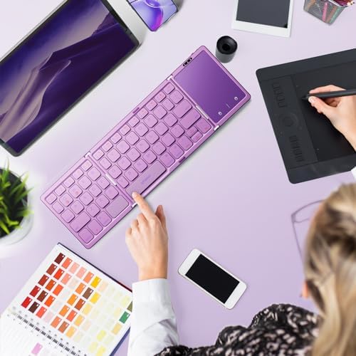【Durable & Stylish Foldable Keyboard】Portable keyboard boasts an aluminum alloy frame that ensures longevity and durability. Its wear-resistant PU leather back shell further adds to its resilience. Equipped with a magnetic folding function, it can be easily stored and transported without the risk of accidentally opening up on its own.