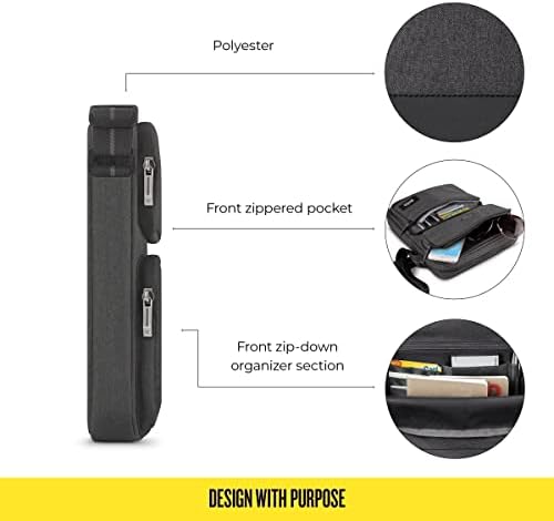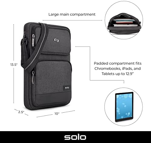 Solo Urban Universal Tablet Sling fits tablets up to 12.9”. The front has zippered pocket and front zip down organizer section that makes it easy to access. Adjustable shoulder strap makes it easy to remove if needed. 5 year warranty included.