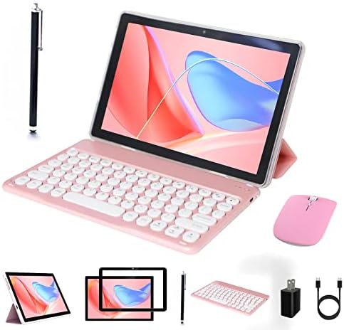 Tablet 10.1 Inch Android 11 OS, 2 in 1 Tablets with Keyboard, Mouse, Case, Stylus, Tempered Film , 64GB ROM+4GB RAM, 8MP Dual Camera, Quad Core Processor, 6000mAh Battery, 1280 * 800 FHD, (Pink/Girl)